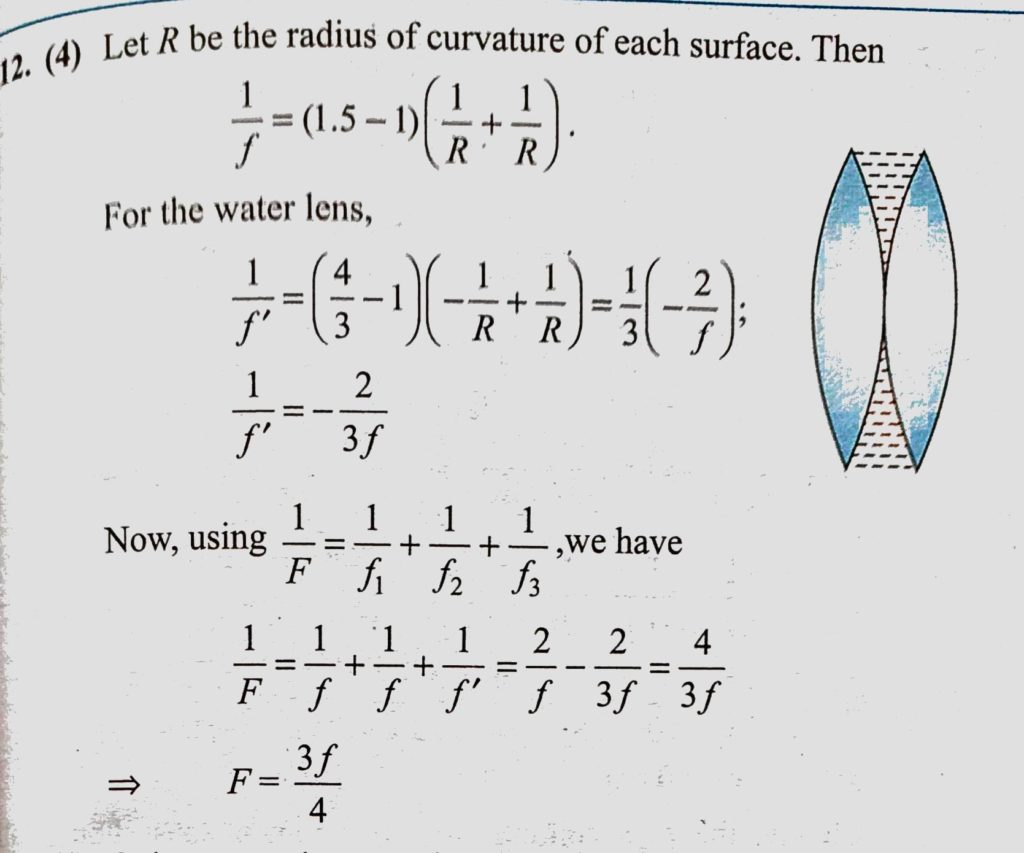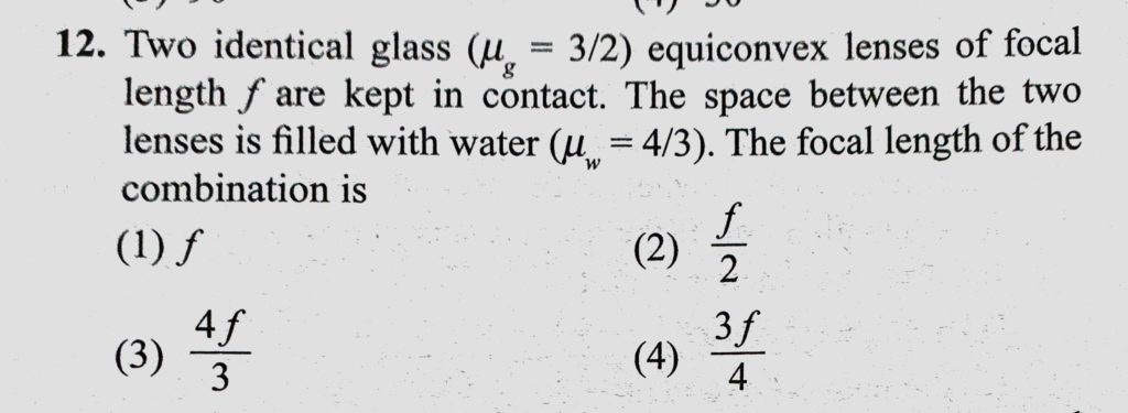 Two identical glass (mu g = 3/2) equiconvex lenses of focal length f are kept in contact. The space between the two lenses is filled with water ( mu w = 4/3). The focal length of the Two identical glass (mu g = 3/2) equiconvex lenses of focal length f are kept in contact. The space between the two lenses is filled with water ( mu w = 4/3). The focal length of the October 8, 2020 Category: Uncategorised (JEE Advanced Physics by BM Sharma + GMP Solutions) , Facebook Messenger WhatsApp Share this:TwitterFacebook Related