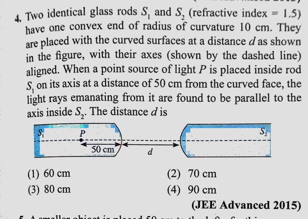 Two identical glass rods S1 and S2 (refractive index = 1.5) have one convex end of radius of curvature 10 cm. They are placed with the curved surfaces at a distance d as shown Two identical glass rods S1 and S2 (refractive index = 1.5) have one convex end of radius of curvature 10 cm. They are placed with the curved surfaces at a distance d as shown October 9, 2020 Category: Uncategorised (JEE Advanced Physics by BM Sharma + GMP Solutions) , Facebook Messenger WhatsApp Share this:TwitterFacebook Related