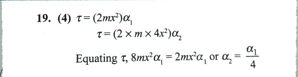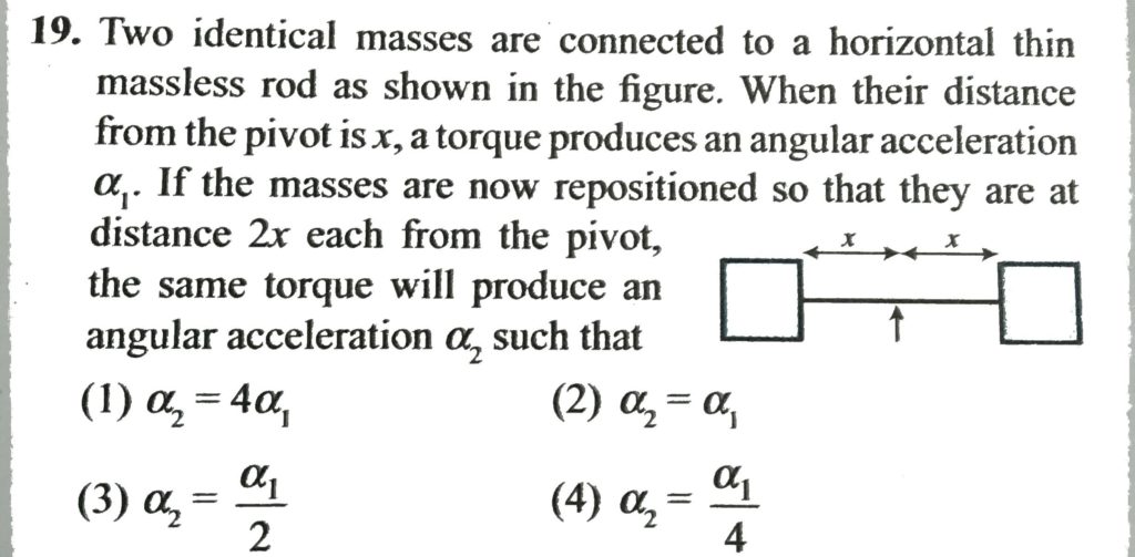 Two identical masses are connected to a horizontal thin massless rod as shown in the figure. When their distance from the pivot is x, a torque produces an angular acceleration α1. If the masses are now repositioned so that they are at distance 2x each from the pivot, the same torque will produce an angular acceleration α2 such that ,