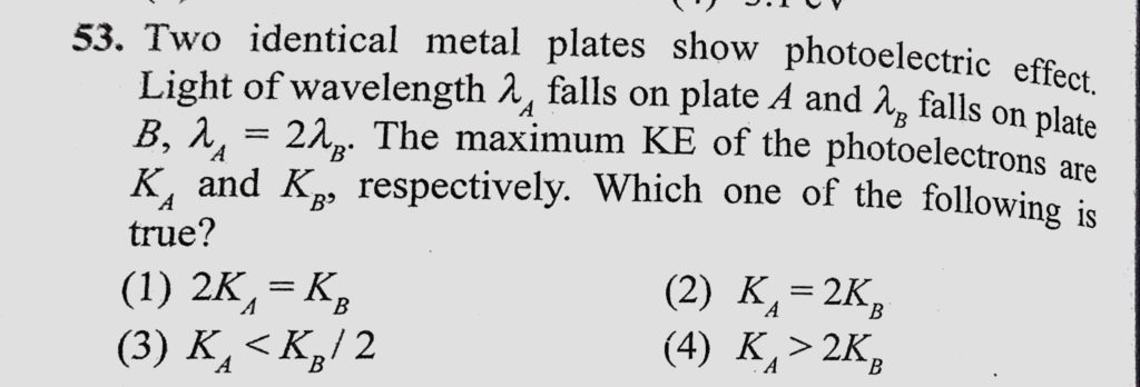 Two identical metal plates shown photoelectric effect. Light of wavelength lemda A falls on plate A and lemda B falls on plate B, lemda A = 2 lemda B. The maximum KE of the photoelectrons are lemda A = 2 lemda B. The maximum KE of the photoelectrons are Two identical metal plates shown photoelectric effect. Light of wavelength lemda A falls on plate A and lemda B falls on plate B October 14, 2020 Category: Uncategorised (JEE Advanced Physics by BM Sharma + GMP Solutions) , Facebook Messenger WhatsApp Share this:TwitterFacebook Related