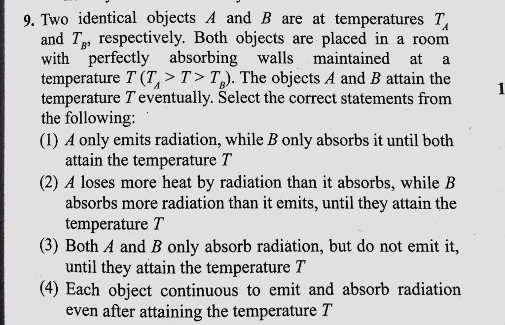 Two identical objects A and B are at temperatures TA and TB, respectively. Both objects are placed in a room with perfectly absorbing walls maintained at a temperature T (TA > T > TB.) respectively. Both objects are placed in a room with perfectly absorbing walls maintained at a temperature T (TA > T > TB.) Two identical objects A and B are at temperatures TA and TB October 25, 2020 Category: Uncategorised (JEE Advanced Physics by BM Sharma + GMP Solutions) , Facebook Messenger WhatsApp Share this:TwitterFacebook Related