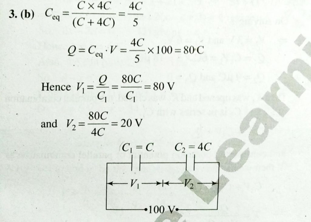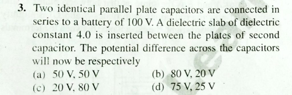 Two identical parallel plate capacitors are connected in series to a battery of 100V. A dielectric slab of dielectric constant 4.0 is inserted between the plates of second capacitor. The potential difference across the capacitors will now be respectively