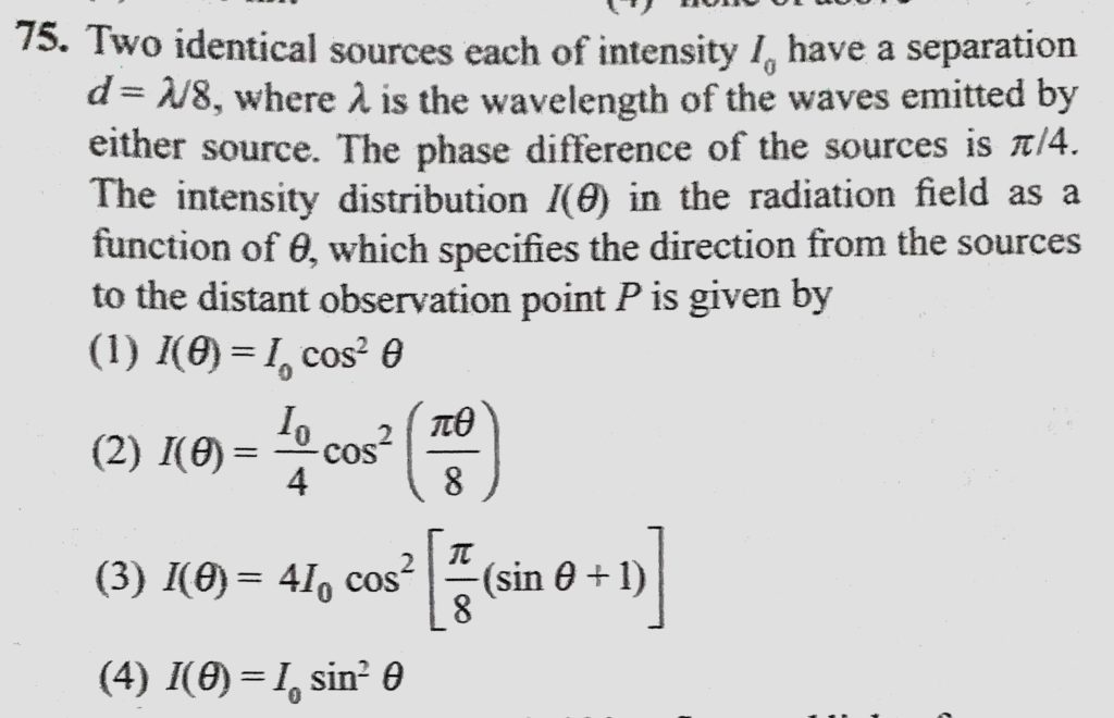 Two identical sources each of intensity I0 have a separation d = lemda/8, where lemda is the wavelength of the waves emitted by either source. The phase difference of the sources Two identical sources each of intensity I0 have a separation d = lemda/8 where lemda is the wavelength of the waves emitted by either source. The phase difference of the sources October 10, 2020 Category: Uncategorised (JEE Advanced Physics by BM Sharma + GMP Solutions) , Facebook Messenger WhatsApp Share this:TwitterFacebook Related