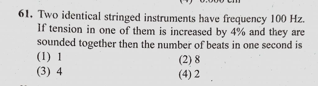 Two identical stringent instruments have frequency 100 Hz. If tension is one of them is increased by 4% and they are sounded together then the number of beats in one second is Two identical stringent instruments have frequency 100 Hz. If tension is one of them is increased by 4% and they are sounded together then the number of beats in one second is November 6, 2020 Category: Uncategorised (JEE Advanced Physics by BM Sharma + GMP Solutions) , Facebook Messenger WhatsApp Share this:TwitterFacebook Related