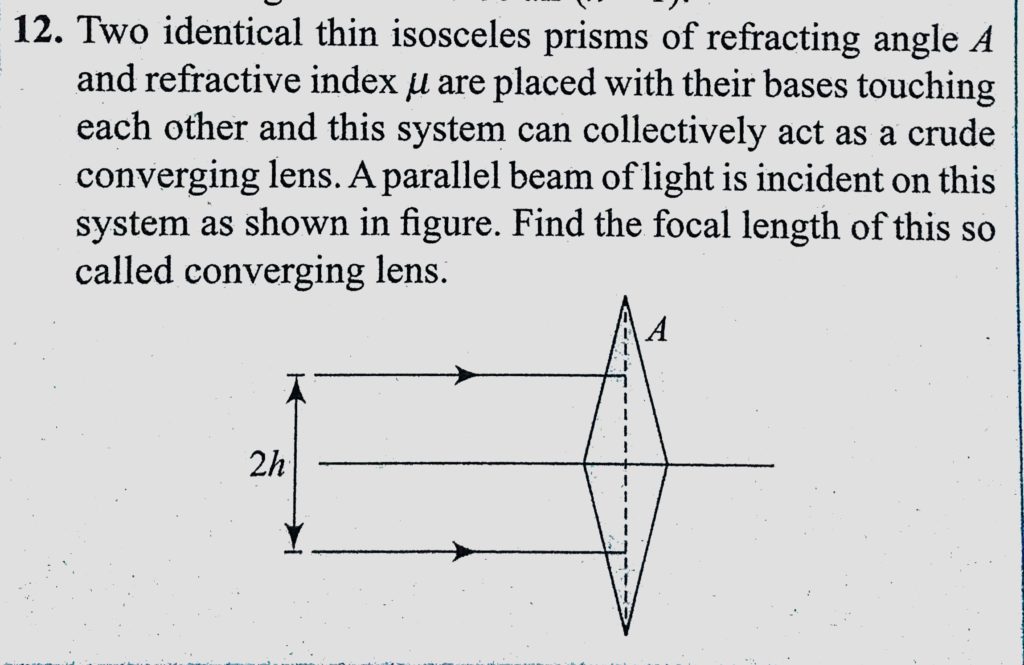 Two identical thin isosceles prisms of refracting angle A and refractive index mu are placed with their bases touching each other and this system can collectively act as a crude converging lens. Two identical thin isosceles prisms of refracting angle A and refractive index mu are placed with their bases touching each other and this system can collectively act as a crude converging lens. October 6, 2020 Category: Uncategorised (JEE Advanced Physics by BM Sharma + GMP Solutions) , Facebook Messenger WhatsApp Share this:TwitterFacebook Related