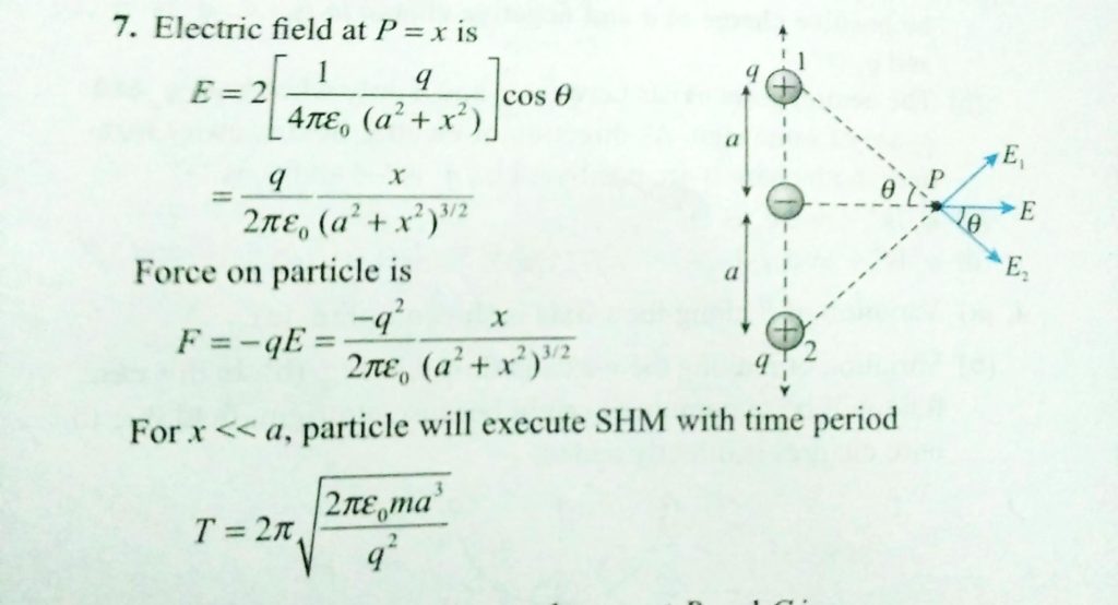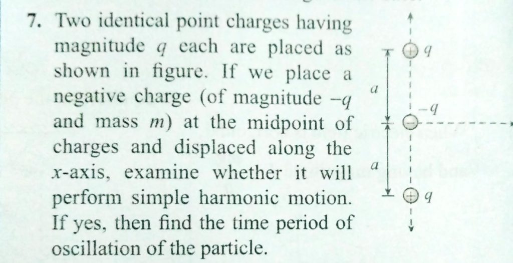 Two indentical point charges having magnitude q each are placed as shown if fig. If we place a negative cahrge (of magnitude -q and mass m)at the midpoint of charges and displaced along the x-axis, examine whether it will perform simpe harmonic motion. If yes then find the time period of oscillation of the particle.