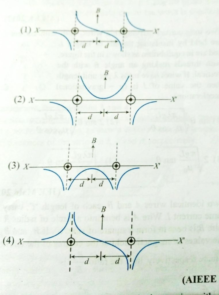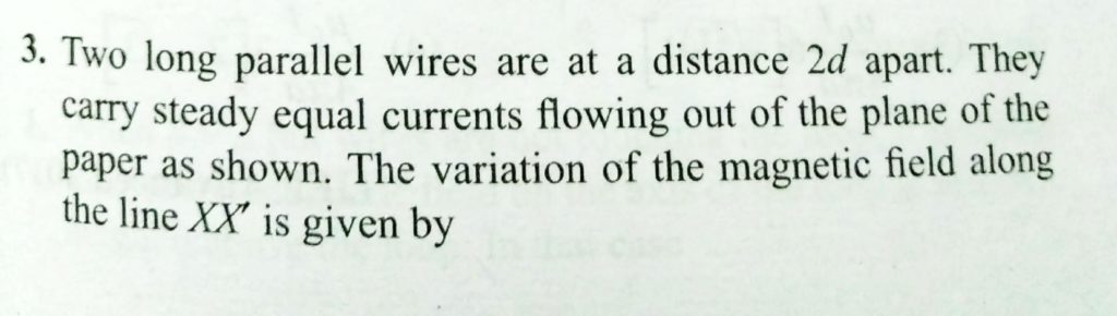 Two long parallel wires at a distance 2 d apart. They carry steady equal currents flowing out of the plane of the paper as shown. The variationn of the magnetic field along the line XX’ is given by Two long parallel wires at a distance 2 d apart. They carry steady equal currents flowing out of the plane of the paper as shown. The variationn of the magnetic field along the line XX' is given by October 17, 2020 Category: Uncategorised (JEE Advanced Physics by BM Sharma + GMP Solutions) , Facebook Messenger WhatsApp Share this:TwitterFacebook Related