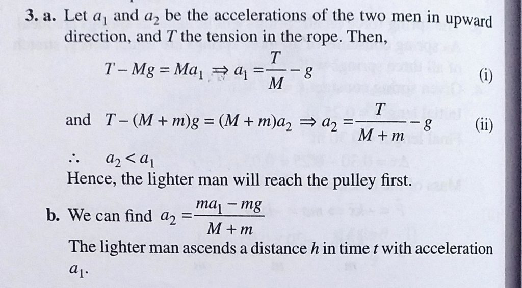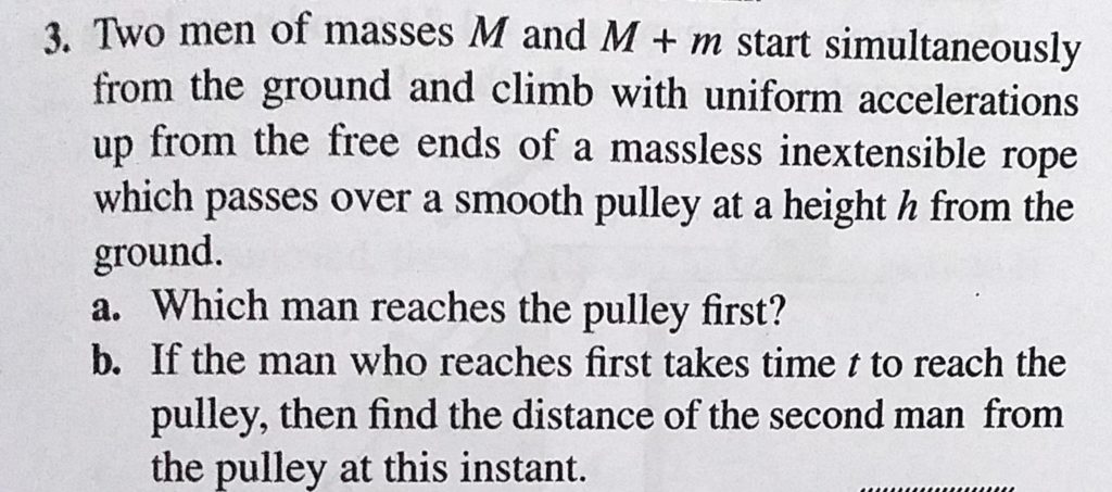 Two men of masses M and M + m start simultaneously from the ground and climb with uniform accelerations up from the free ends of a massless inextensible rope which passes over a smooth pulley Two men of masses M and M + m start simultaneously from the ground and climb with uniform accelerations up from the free ends of a massless inextensible rope which passes over a smooth pulley September 29, 2020 Category: Uncategorised (JEE Advanced Physics by BM Sharma + GMP Solutions) , Facebook Messenger WhatsApp Share this:TwitterFacebook Related