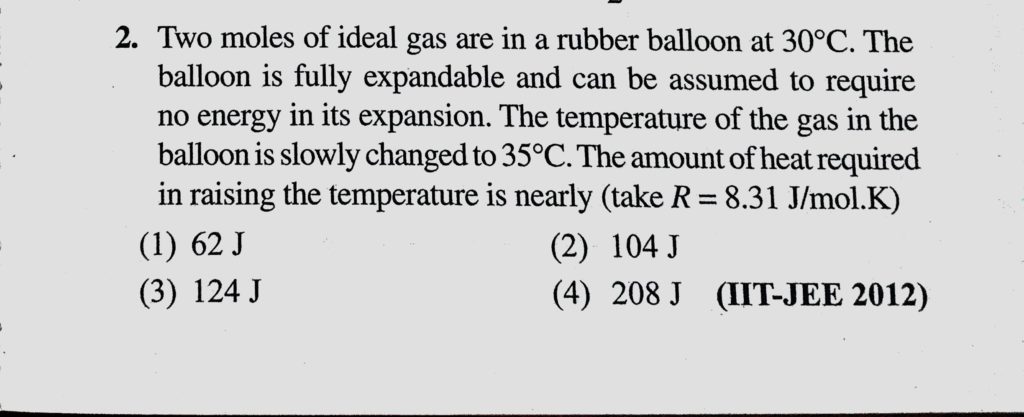 Two moles of ideal gas are in a rubber balloon at 30 C. The balloon is fully expandable and can be assumed to require no energy in its expansion. The temperature of the gas in the balloon is Two moles of ideal gas are in a rubber balloon at 30 C. The balloon is fully expandable and can be assumed to require no energy in its expansion. The temperature of the gas in the balloon is October 30, 2020 Category: Uncategorised (JEE Advanced Physics by BM Sharma + GMP Solutions) , Facebook Messenger WhatsApp Share this:TwitterFacebook Related