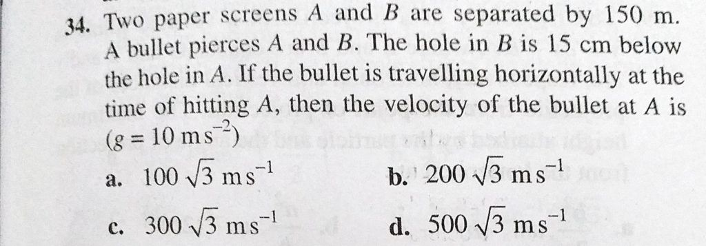 Two paper screens A and B are separated by 150 m. A bullet pierces A and B. The hole is B is 15 cm below the hole in A. If the bullet is travelling horizontally at the time of hitting a Two paper screens A and B are separated by 150 m. A bullet pierces A and B. The hole is B is 15 cm below the hole in A. If the bullet is travelling horizontally at the time of hitting a September 22, 2020 Category: Uncategorised (JEE Advanced Physics by BM Sharma + GMP Solutions) , Facebook Messenger WhatsApp Share this:TwitterFacebook Related