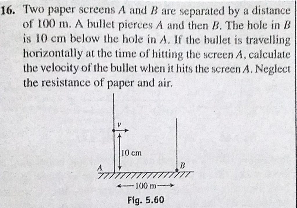Two paper screens A and B are separated by a distance of 100 m. A bullet pierces A and then B. The hole in B is 10 cm below the hole in A. If the bullet is travelling horizontally at the time of hitting the screen A, An object is thrown between two tall buildings 180 m from each other. The object thrown horizontally from a window 55 m above the ground from one building strikes a window 10 m above the ground September 21, 2020 Category: Uncategorised (JEE Advanced Physics by BM Sharma + GMP Solutions) , Facebook Messenger WhatsApp Share this:TwitterFacebook Related