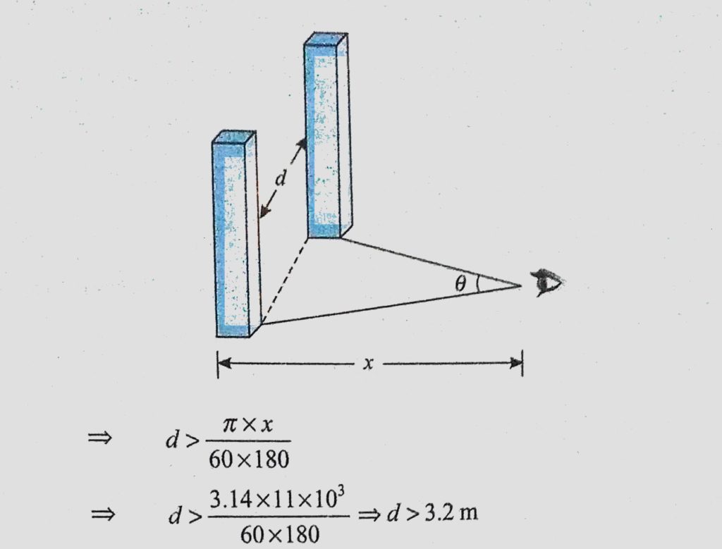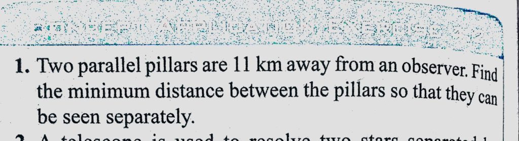 Two parallel pillars are 11 km away from an observer. Find the minimum distance between the pillars so that they can be seen separately. Two parallel pillars are 11 km away from an observer. Find the minimum distance between the pillars so that they can be seen separately. October 11, 2020 Category: Uncategorised (JEE Advanced Physics by BM Sharma + GMP Solutions) , Facebook Messenger WhatsApp Share this:TwitterFacebook Related