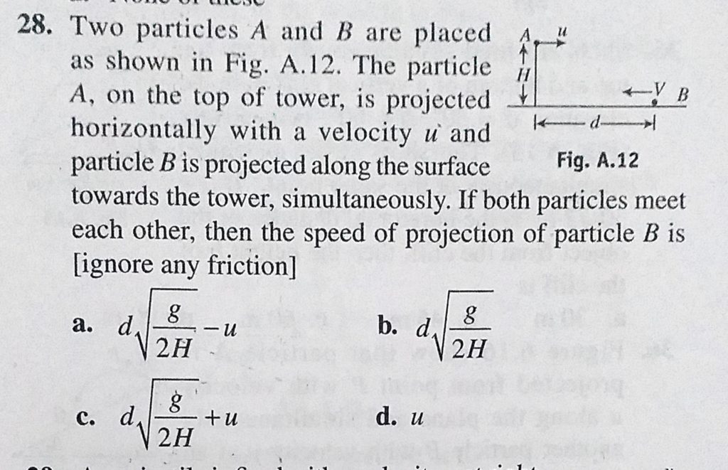 Two particles A and B are placed as shown in Fig. A.12. The particle A, on the top of tower, is projected horizontally with a velocity u and particle B is projected along the surface towards the tower, simultaneously. is projected horizontally with a velocity u and particle B is projected along the surface towards the tower on the top of tower simultaneously. Two particles A and B are placed as shown in Fig. A.12. The particle A September 24, 2020 Category: Uncategorised (JEE Advanced Physics by BM Sharma + GMP Solutions) , Facebook Messenger WhatsApp Share this:TwitterFacebook Related