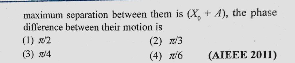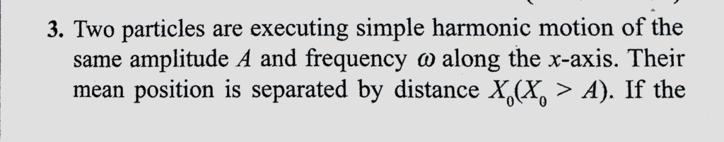 Two particles are executing simple harmonic motion of the sample amplitude A and frequency omega along the x-axis. Their mean position is separated by distance X0 (X0 > A). If the Two particles are executing simple harmonic motion of the sample amplitude A and frequency omega along the x-axis. Their mean position is separated by distance X0 (X0 > A). If the October 31, 2020 Category: Uncategorised (JEE Advanced Physics by BM Sharma + GMP Solutions) , Facebook Messenger WhatsApp Share this:TwitterFacebook Related