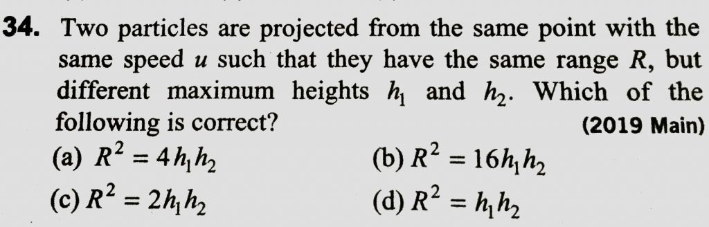Two particles are projected from the same point with the same speed u such that they have the same range R, but different maximum heights, h 1 and h 2. Which of the following is correct ? but different maximum heights h 1 and h 2. Which of the following is correct ? Two particles are projected from the same point with the same speed u such that they have the same range R February 13, 2021 Category: Uncategorised (JEE Advanced Physics by BM Sharma + GMP Solutions) , Facebook Messenger WhatsApp Share this:TwitterFacebook Related