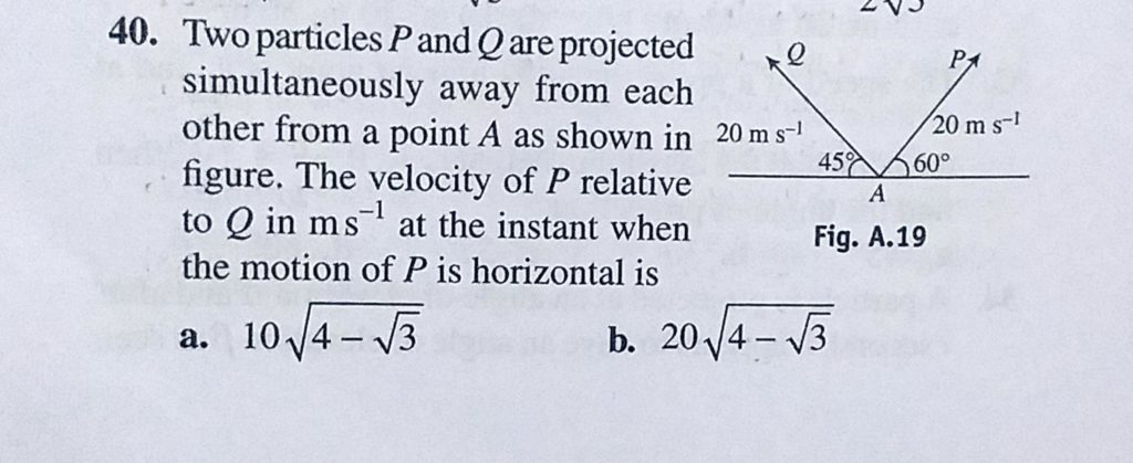 Two particles P and Q are projected simultaneously away from each other from a point A as shown in figure. The velocity of P relative to Q in m/s at the instant when the motion of P is horizontal is Two particles P and Q are projected simultaneously away from each other from a point A as shown in figure. The velocity of P relative to Q in m/s at the instant when the motion of P is horizontal is September 24, 2020 Category: Uncategorised (JEE Advanced Physics by BM Sharma + GMP Solutions) , Facebook Messenger WhatsApp Share this:TwitterFacebook Related