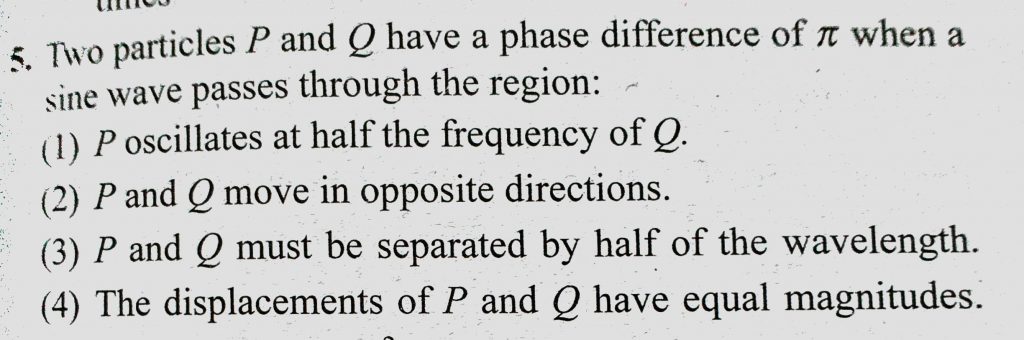 Two particles P and Q have a phase difference of pie when a sine wave passes through the region: (1) P oscillates at half the frequency of Q. (2) P and Q move in opposite directions. Two particles P and Q have a phase difference of pie when a sine wave passes through the region: (1) P oscillates at half the frequency of Q. (2) P and Q move in opposite directions. November 5, 2020 Category: Uncategorised (JEE Advanced Physics by BM Sharma + GMP Solutions) , Facebook Messenger WhatsApp Share this:TwitterFacebook Related