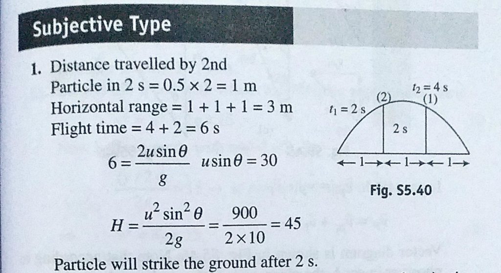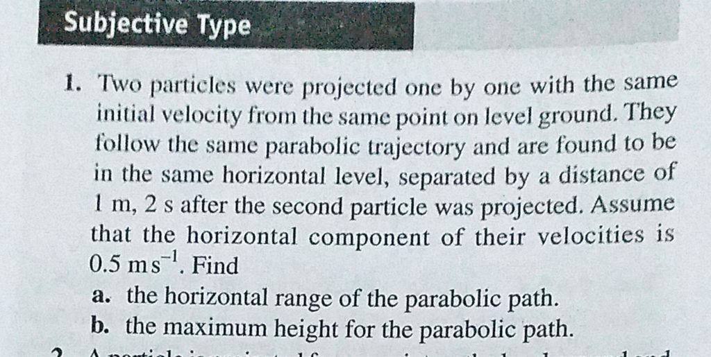 Two particles were projected one by one with the same initial velocity from the same point on level ground. They follow the same prabolic trajectory and are found to be in the same horizontal level, separated by a distance of 1 m, 2 s after the second paricle was projected. Assume that the horizontal component of their velocities is 0.5 m/s.