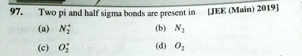 Two Pi and half sigma bonds are present in (a) Na2^+ (b) N2 (c) O2^+ (d) O2 Two Pi and half sigma bonds are present in (a) Na2^+ (b) N2 (c) O2^+ (d) O2 December 10, 2020 Category: Uncategorised (JEE Advanced Physics by BM Sharma + GMP Solutions) , Facebook Messenger WhatsApp Share this:TwitterFacebook Related