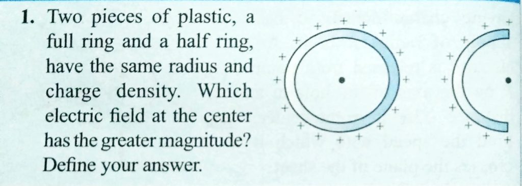 Two pieces of plastic , a full ring and a half ring have the same radius and charge density. which electric field at the centre has the greater magnitude? Define your answer. a full ring and a half ring have the same radius and charge density. which electric field at the centre has the greater magnitude? Define your answer. Two pieces of plastic October 28, 2020 Category: Uncategorised (JEE Advanced Physics by BM Sharma + GMP Solutions) , Facebook Messenger WhatsApp Share this:TwitterFacebook Related