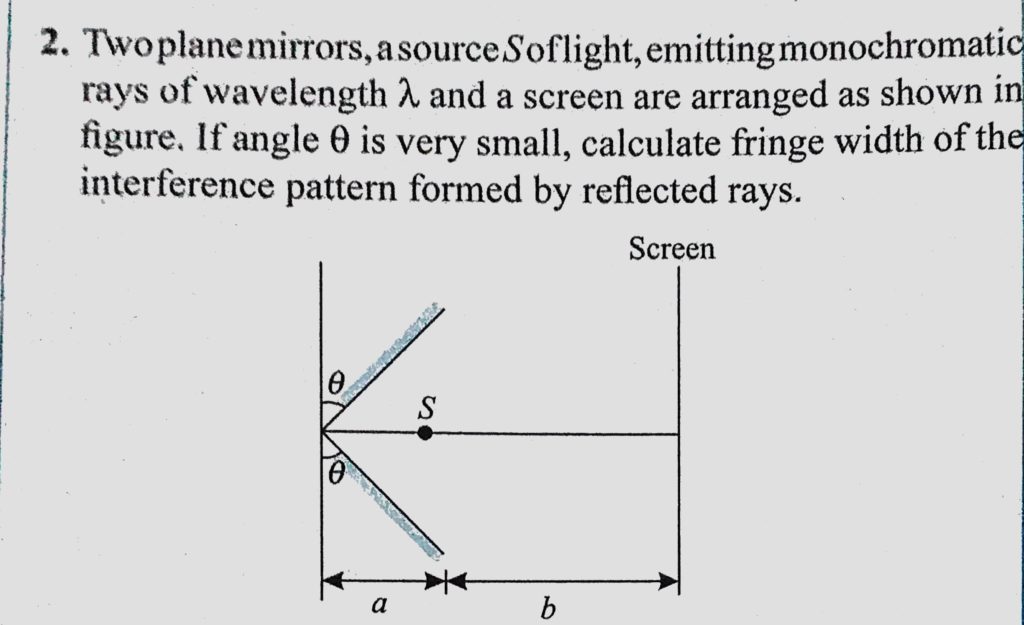 Two plane mirrors, a source S of light, emitting monochromatic rays of wavelength lemda and a screen are arranged as shown in figure. If angle theta is very small, calculate fringe width of the interference a source S of light calculate fringe width of the interference emitting monochromatic rays of wavelength lemda and a screen are arranged as shown in figure. If angle theta is very small Two plane mirrors October 11, 2020 Category: Uncategorised (JEE Advanced Physics by BM Sharma + GMP Solutions) , Facebook Messenger WhatsApp Share this:TwitterFacebook Related