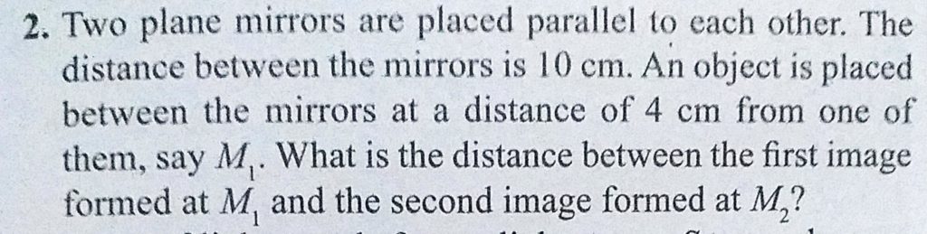 Two plane mirrors are placed parallel to each other. The distance between the mirror is 10 cm. An object is placed between the mirrors at a distance of 4 cm from one of them, say M1. say M1. Two plane mirrors are placed parallel to each other. The distance between the mirror is 10 cm. An object is placed between the mirrors at a distance of 4 cm from one of them October 5, 2020 Category: Uncategorised (JEE Advanced Physics by BM Sharma + GMP Solutions) , Facebook Messenger WhatsApp Share this:TwitterFacebook Related