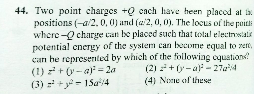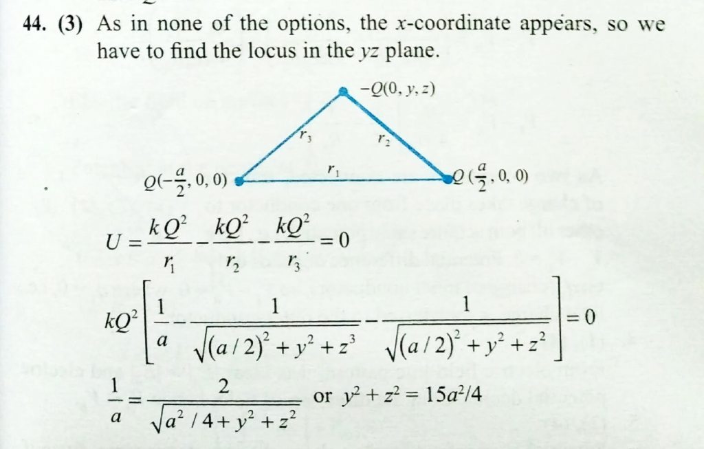 Two point charges +q each have been place at the positions ( -a/2 ,0 ,0 )and ( a/2 , 0, 0 ). THe locus of the points where -Q charge can be placed suvh that total electrostatic potential energy of the system can become equal to Zero, can be represented by which of the following equations ?