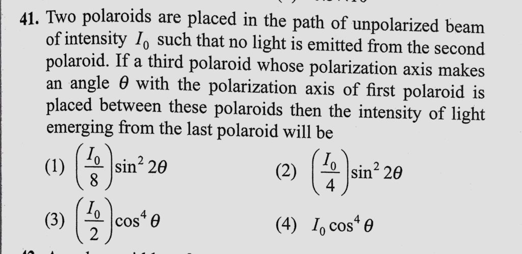 Two polaroids are placed in the path of unpolarized beam of intensity I0 such that no light is emitted from the second polaroid. If a third polaroid whose polarization axis makes an angle theta Two polaroids are placed in the path of unpolarized beam of intensity I0 such that no light is emitted from the second polaroid. If a third polaroid whose polarization axis makes an angle theta October 12, 2020 Category: Uncategorised (JEE Advanced Physics by BM Sharma + GMP Solutions) , Facebook Messenger WhatsApp Share this:TwitterFacebook Related