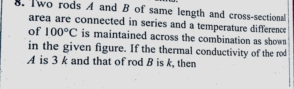 Two rods A and B of same length and cross-sectional area are connected in series and a temperature difference of 100 c is maintained across the combined as shown in the given figure. Two rods A and B of same length and cross-sectional area are connected in series and a temperature difference of 100 c is maintained across the combined as shown in the given figure. October 24, 2020 Category: Uncategorised (JEE Advanced Physics by BM Sharma + GMP Solutions) , Facebook Messenger WhatsApp Share this:TwitterFacebook Related
