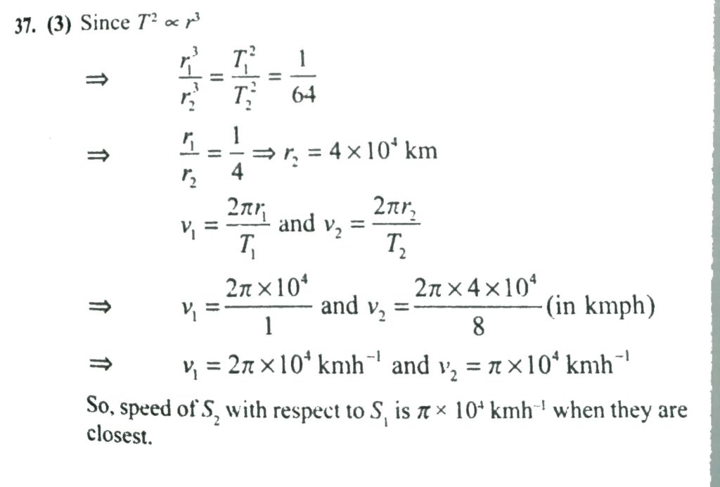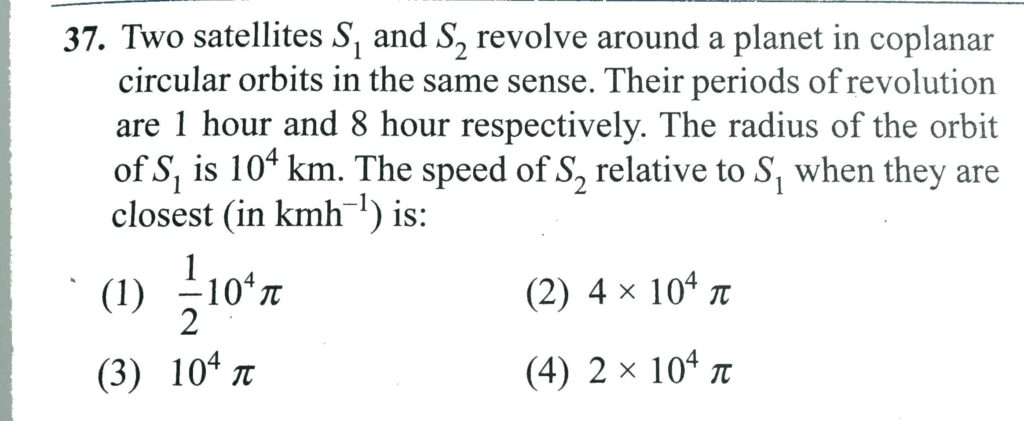 Two satellites s1 and s2 revolve around a planet in coplanar circular orbits in the same sense. THeri periods of revolution are 1 hour and 8 hour respectively. The radius of the orbit of s1 is 10^4 km. The speed of S2 relative to S1 when they are closest (in km/h ) is