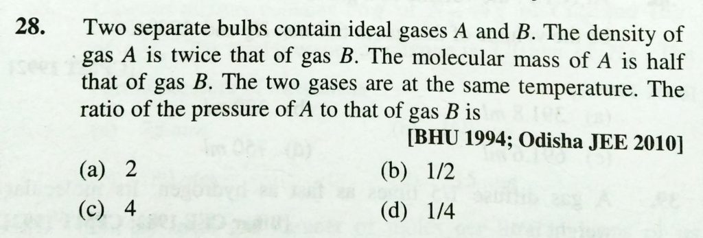 Two separate bulbs contain ideal gases A and B. The density of A is twice as that of gas B. The molecular mass of gas A is half as that of B. If two gases are at same temperature, the ratio of the pressure of A to that of B is: the ratio of the pressure of A to that of B is: Two separate bulbs contain ideal gases A and B. The density of A is twice as that of gas B. The molecular mass of gas A is half as that of B. If two gases are at same temperature February 10, 2021 Category: Uncategorised (JEE Advanced Physics by BM Sharma + GMP Solutions) , Facebook Messenger WhatsApp Share this:TwitterFacebook Related