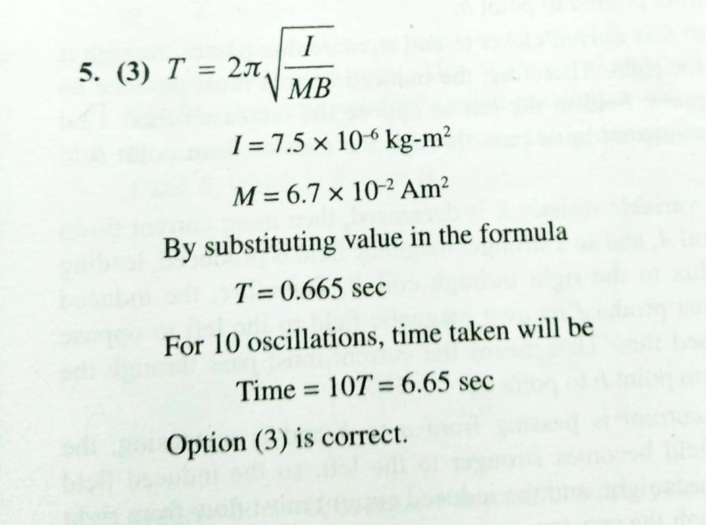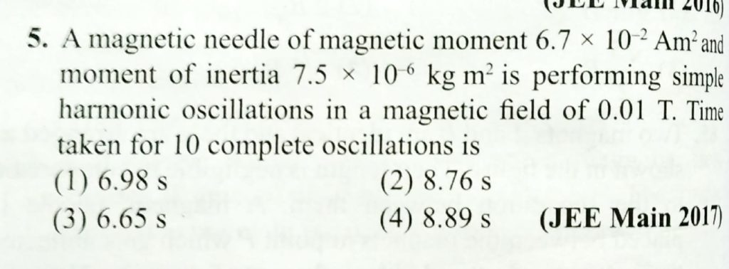 A magnetic needle of magnetic moment 6.7 x 10^-2 Am^2 and moment of interia 7.5 x 10^-6 Kg m^2 is performing simple harmonic oscillation in a magnetic field of 0.01 T. time taken for 10 complete oscillation is The magnet of a vibration magnetometer is heated so as to reduce its magnetic moment by 36 %. By doing this the period time of the magnetometer will October 19, 2020 Category: Uncategorised (JEE Advanced Physics by BM Sharma + GMP Solutions) , Facebook Messenger WhatsApp Share this:TwitterFacebook Related