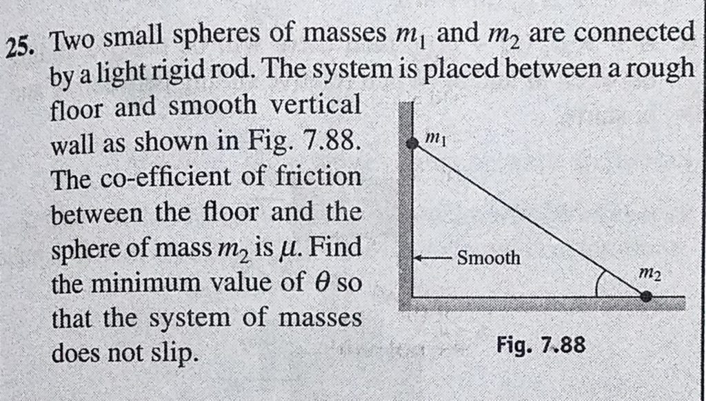 Two small spheres of masses m1 and m2 are connected by a light rod. The system is placed between a rough floor and smooth vertical wall as shown in Fig. 7.88. The co-efficient of friction Two small spheres of masses m1 and m2 are connected by a light rod. The system is placed between a rough floor and smooth vertical wall as shown in Fig. 7.88. The co-efficient of friction September 30, 2020 Category: Uncategorised (JEE Advanced Physics by BM Sharma + GMP Solutions) , Facebook Messenger WhatsApp Share this:TwitterFacebook Related