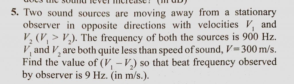 Two sound sources are moving away from a stationary observer in opposite directions with velocities V1 and V2 (V1 > V2). The frequency of both the sources is 900 Hz. V1 and V2 are both Two sound sources are moving away from a stationary observer in opposite directions with velocities V1 and V2 (V1 > V2). The frequency of both the sources is 900 Hz. V1 and V2 are both November 8, 2020 Category: Uncategorised (JEE Advanced Physics by BM Sharma + GMP Solutions) , Facebook Messenger WhatsApp Share this:TwitterFacebook Related