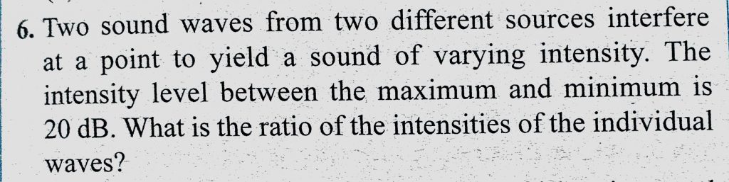Two sound waves from two different sources interfere at a point to yield a sound of varying intensity. The intensity level between the maximum and minimum is 20 dB. What is the Two sound waves from two different sources interfere at a point to yield a sound of varying intensity. The intensity level between the maximum and minimum is 20 dB. What is the November 7, 2020 Category: Uncategorised (JEE Advanced Physics by BM Sharma + GMP Solutions) , Facebook Messenger WhatsApp Share this:TwitterFacebook Related