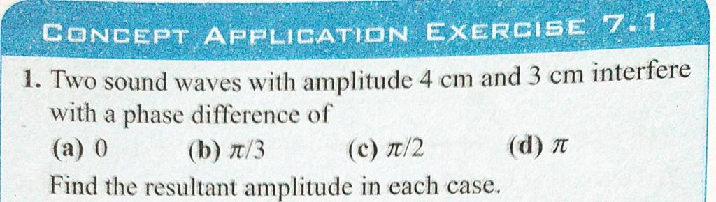 Two sound waves with amplitude 4 cm and 3 cm interfere with a phase difference of (a) 0 (b) pie/3 (c) pie/2 (d) pie Find the resultant amplitude in each case. Two sound waves with amplitude 4 cm and 3 cm interfere with a phase difference of (a) 0 (b) pie/3 (c) pie/2 (d) pie Find the resultant amplitude in each case. November 5, 2020 Category: Uncategorised (JEE Advanced Physics by BM Sharma + GMP Solutions) , Facebook Messenger WhatsApp Share this:TwitterFacebook Related