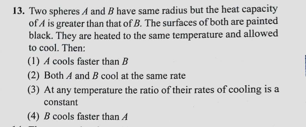 Two spheres A and B have same radius but the heat capacity of A is greater than that of B. The surfaces of both are painted black. They are heated to the same temperature and allowed to cool. Two spheres A and B have same radius but the heat capacity of A is greater than that of B. The surfaces of both are painted black. They are heated to the same temperature and allowed to cool. October 25, 2020 Category: Uncategorised (JEE Advanced Physics by BM Sharma + GMP Solutions) , Facebook Messenger WhatsApp Share this:TwitterFacebook Related