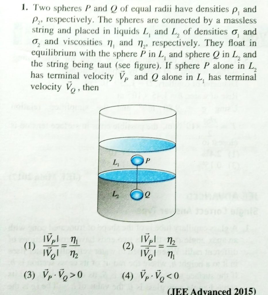 Two spheres P and Q of equal radii have densities ρ1 and ρ2, respectively. The spheres are connected by a massless string and placed in liquids L1 and L2 of densities σ1 and σ2 and viscosities η1 and η2, respectively. They float in equilibrium with the sphere P in L1 and sphere Q in L2 and the string being taut(see figure). If sphere P alone in L2 has terminal velocity Vp and Q alone in L1 has terminal velocity VQ, then