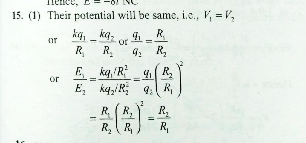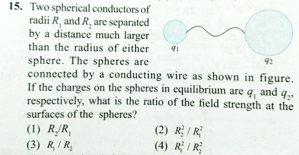 Two spherical conductors of radii R1 and R2 are separated by a distance much larger than the radius of eighter sphere. The spheres are connected by a conducting wire as shown in (Fig. 3.128). If the charges on the spheres in equilibrium are q1andq2, respectively, what is the ratio of the field strength at the surfaces of the spheres ?
