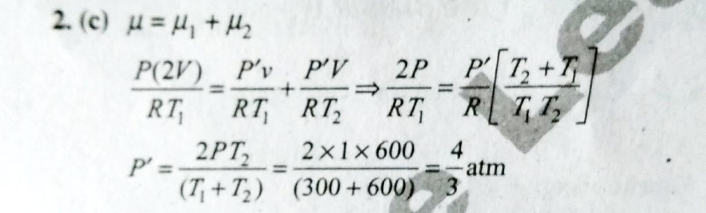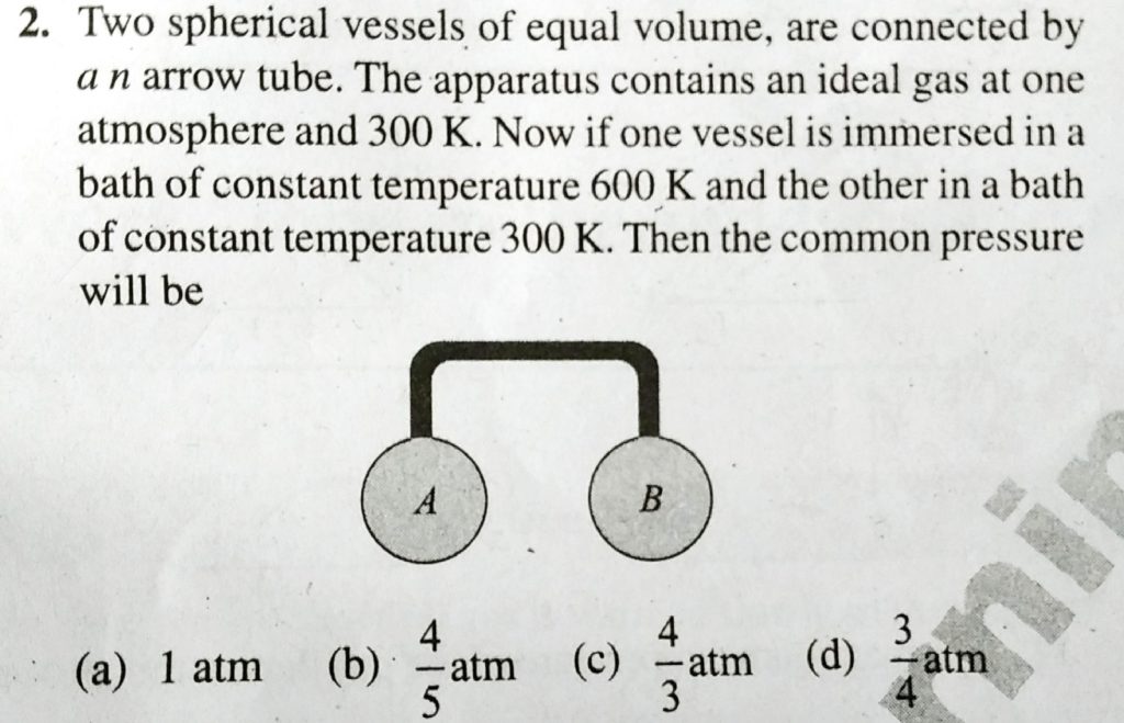 Two spherical vessel of equal volume are connected by a n arrow tube. The apparatus contains an ideal gas at one atmosphere and 300K. Now if one vessel is immersed in a bath of constant temperature 600K and the other in a bath of constant temperature 300 K. then the common pressure will be
