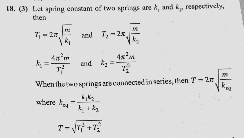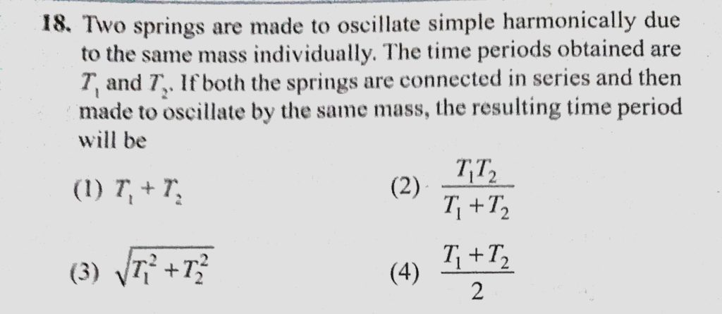 Two springs are made to oscillate simple harmonically due to the same mass individually. The time periods obtained are T1 and T2. If both the springs are connected in series and then Two springs are made to oscillate simple harmonically due to the same mass individually. The time periods obtained are T1 and T2. If both the springs are connected in series and then October 30, 2020 Category: Uncategorised (JEE Advanced Physics by BM Sharma + GMP Solutions) , Facebook Messenger WhatsApp Share this:TwitterFacebook Related
