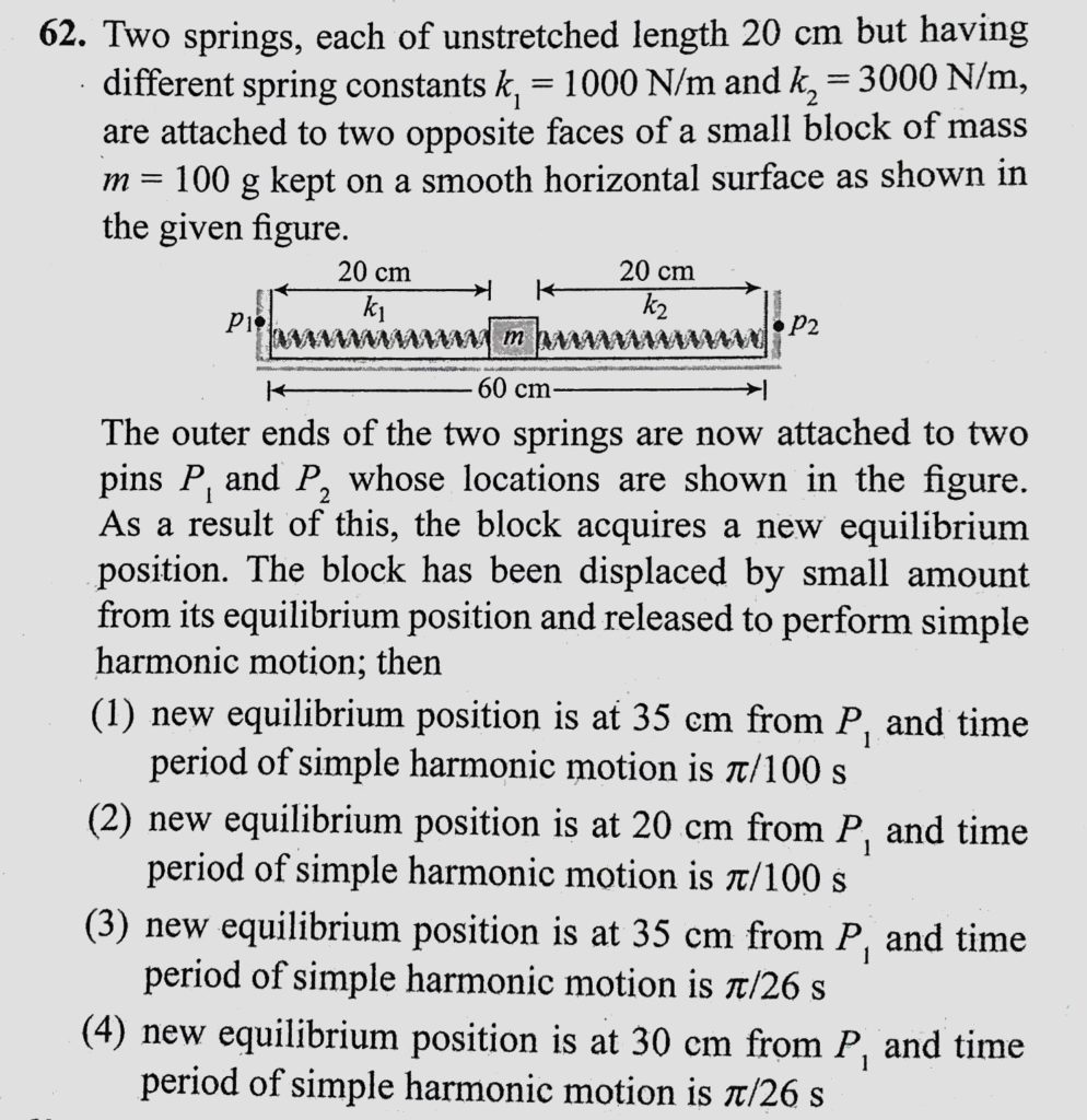 Two springs, each of unstretched length 20 cm but having different spring constants k1 = 1000 N/m and k2 = 3000 N/m, are attached to two opposite faces of a small block of mass are attached to two opposite faces of a small block of mass each of unstretched length 20 cm but having different spring constants k1 = 1000 N/m and k2 = 3000 N/m Two springs October 31, 2020 Category: Uncategorised (JEE Advanced Physics by BM Sharma + GMP Solutions) , Facebook Messenger WhatsApp Share this:TwitterFacebook Related