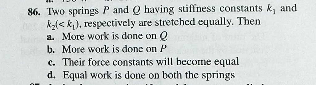 Two springs P and Q having stiffness constants k1 and k2 (<k1), respectively are stretched equally. Then respectively are stretched equally. Then Two springs P and Q having stiffness constants k1 and k2 (<k1) October 4, 2020 Category: Uncategorised (JEE Advanced Physics by BM Sharma + GMP Solutions) , Facebook Messenger WhatsApp Share this:TwitterFacebook Related