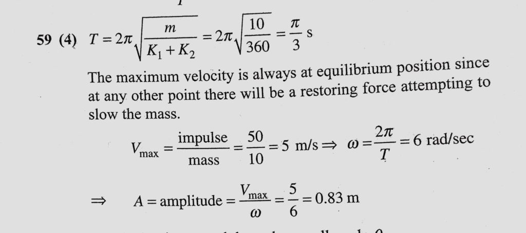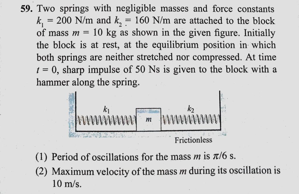 Two springs with negligible masses and force constants k1 = 200 N/m and k2 = 160 N/m are attached to the block of mass m = 10 kg as shown in the given figure. Initially the block Two springs with negligible masses and force constants k1 = 200 N/m and k2 = 160 N/m are attached to the block of mass m = 10 kg as shown in the given figure. Initially the block October 31, 2020 Category: Uncategorised (JEE Advanced Physics by BM Sharma + GMP Solutions) , Facebook Messenger WhatsApp Share this:TwitterFacebook Related