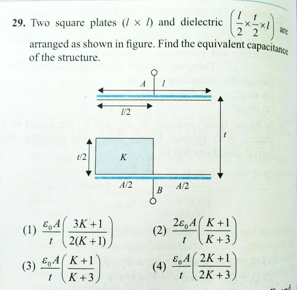 Two squares plates ( l x l ) and dielectric [1/2 x t/2 x l ] are arranged as shown in figure. Find the equivalent capacitance of the structure. Two squares plates ( l x l ) and dielectric [1/2 x t/2 x l ] are arranged as shown in figure. Find the equivalent capacitance of the structure. November 8, 2020 Category: Uncategorised (JEE Advanced Physics by BM Sharma + GMP Solutions) , Facebook Messenger WhatsApp Share this:TwitterFacebook Related
