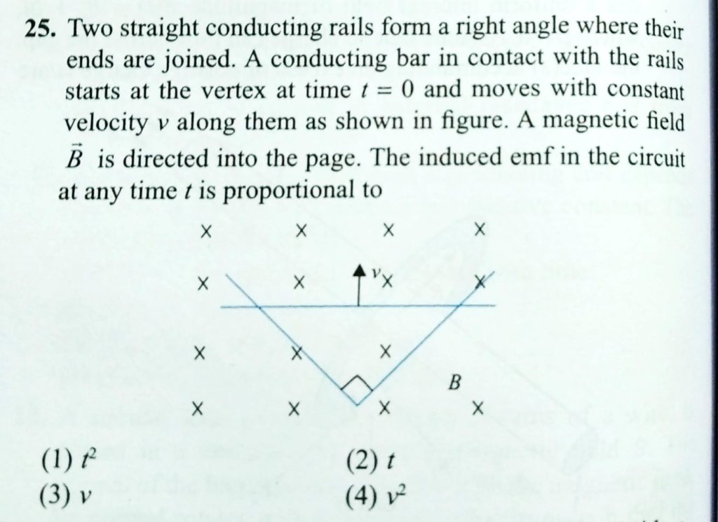 Two straight conducting rails form a right angle where their ends are joined. A conducting bar in contact with the rails starts at the vertex at time t = 0 and moves with constant velocity v along them as shown in Fig. A magnetic field B is directed into the page. the induced emf in the circuit at any time t is proportional to