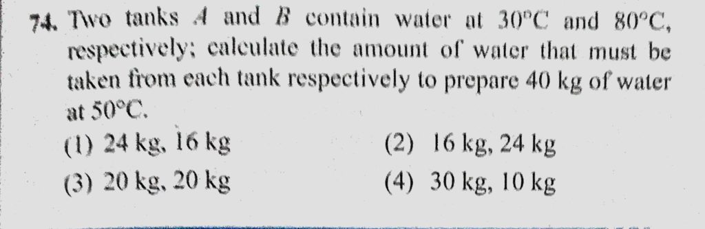Two tanks A and B contain water at 30 C and 80 C, respectively: calculate the amount of water that must be taken from each tank respectively to prepare 40 kg of water at 50 C. respectively: calculate the amount of water that must be taken from each tank respectively to prepare 40 kg of water at 50 C. Two tanks A and B contain water at 30 C and 80 C October 24, 2020 Category: Uncategorised (JEE Advanced Physics by BM Sharma + GMP Solutions) , Facebook Messenger WhatsApp Share this:TwitterFacebook Related