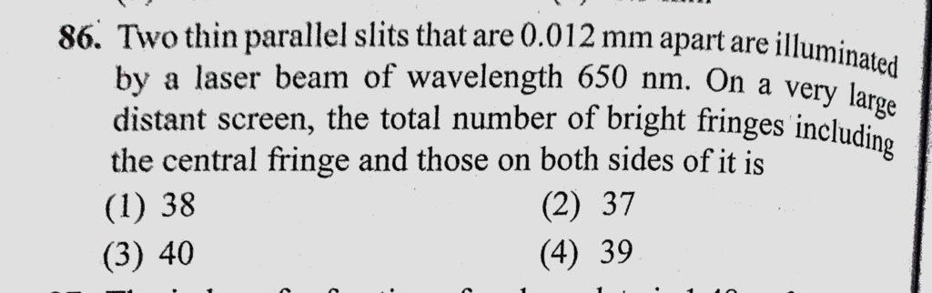 Two thin parallel slits that are 0.012 mm apart are illuminated by a laser beam of wavelength 650 nm. On a very large distant screen, the total number of bright fringes including the central fringe the total number of bright fringes including the central fringe Two thin parallel slits that are 0.012 mm apart are illuminated by a laser beam of wavelength 650 nm. On a very large distant screen October 10, 2020 Category: Uncategorised (JEE Advanced Physics by BM Sharma + GMP Solutions) , Facebook Messenger WhatsApp Share this:TwitterFacebook Related