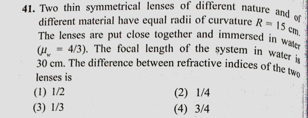 Two thin symmetrical lenses of different nature and of different material have equal radii of curvature R = 15 cm. The lenses are put close together and immersed in water (mu w = 4/3). Two thin symmetrical lenses of different nature and of different material have equal radii of curvature R = 15 cm. The lenses are put close together and immersed in water (mu w = 4/3). October 8, 2020 Category: Uncategorised (JEE Advanced Physics by BM Sharma + GMP Solutions) , Facebook Messenger WhatsApp Share this:TwitterFacebook Related