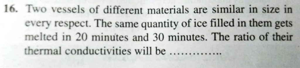 Two vessels of different materials are similar in size in every respect. The same quantity of ice filled in them gets melted in 20 minutes and 30 minutes respectively. The ratio of thermal conductivities of the materials is The rate at which the energy conducted upward is October 4, 2020 Category: Uncategorised (JEE Advanced Physics by BM Sharma + GMP Solutions) , Facebook Messenger WhatsApp Share this:TwitterFacebook Related